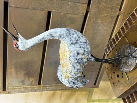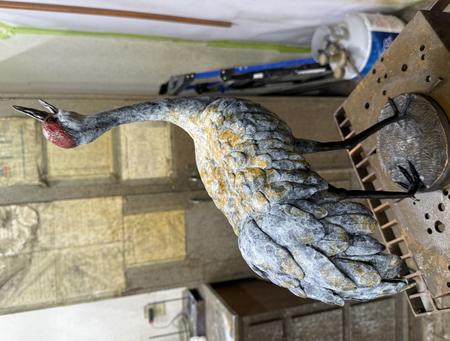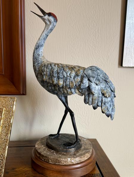This 2nd set of photos is of a female sandhill crane engaged in "unison calling". She is shown after being cast in bronze and a patina applied. Mated pairs perform a coordinated duet to strengthen their bond and/or protect their territory. The pair will often stand together with heads thrown back, each with a distinct call. You can tell this is a female from the angle of her beak. I am calling this one, Language of Love.
